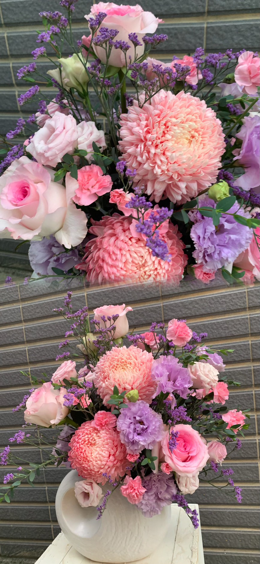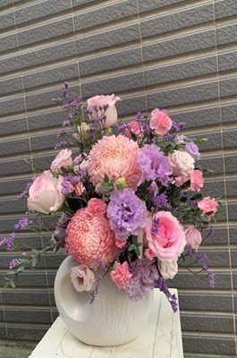 花材:進口粉色玫瑰、進口大菊牡丹菊、補血草、與其他配材
