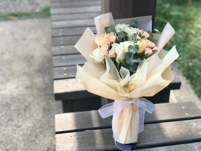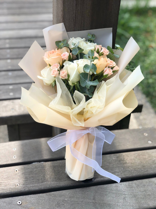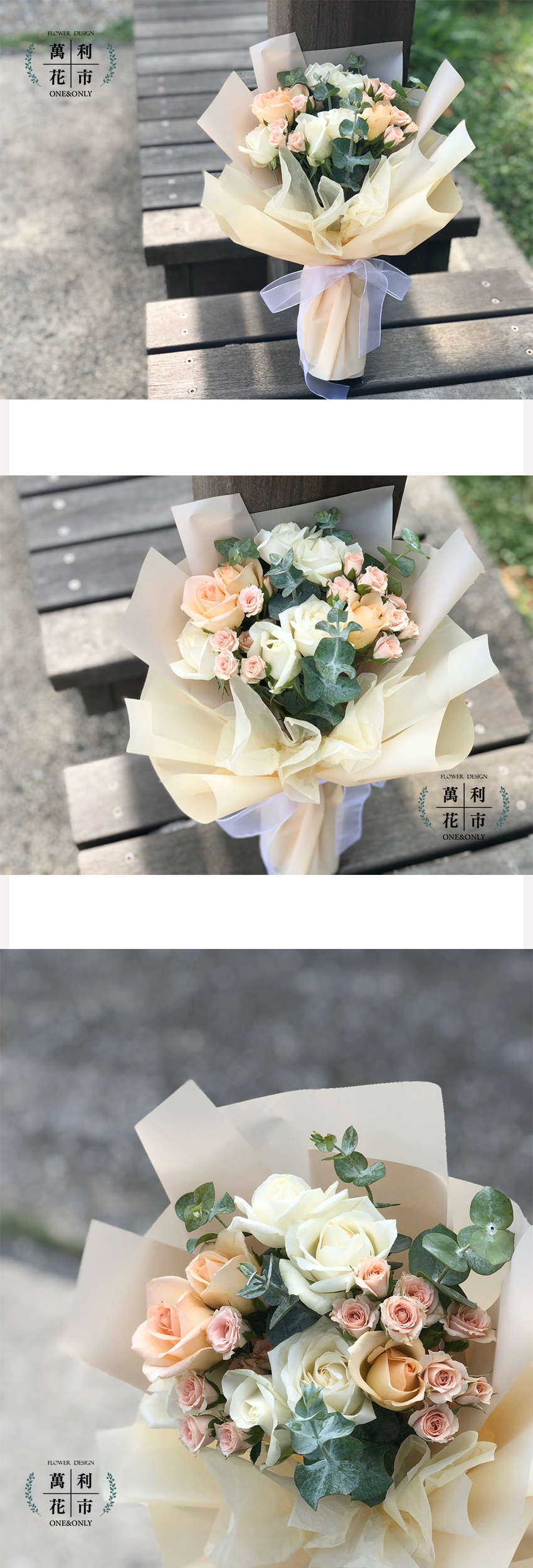 花材 :白玫瑰、香檳玫瑰、淺粉迷你玫瑰、尤加利葉